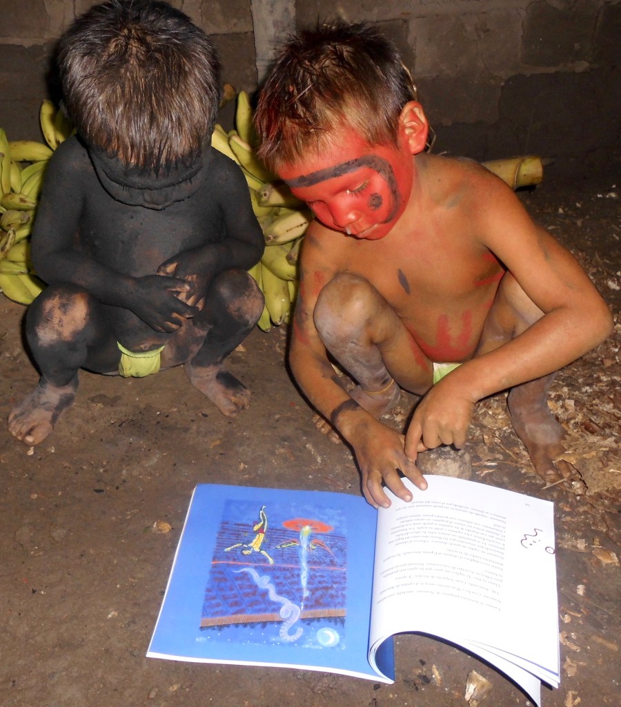 Yanomami children looking at their copies of the book “La Magia de la Amazonia” in Alto Orinoco, Amazonas, Venezuela. The story was read out loud to them in the Yanomami language. The boy in the photo at the top is wearing his father’s traditional monkey tail headdress. The children’s traditional face and body paint is made from Achiote and charcoal.