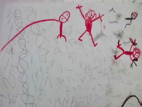 Yanomami holding the cremated remains of their dead after their family was slaughtered by gold miners in the community of Haximu / « Xawara epidemic smoke killing a Yanomami community » – drawing on paper – Anoami Yanomami