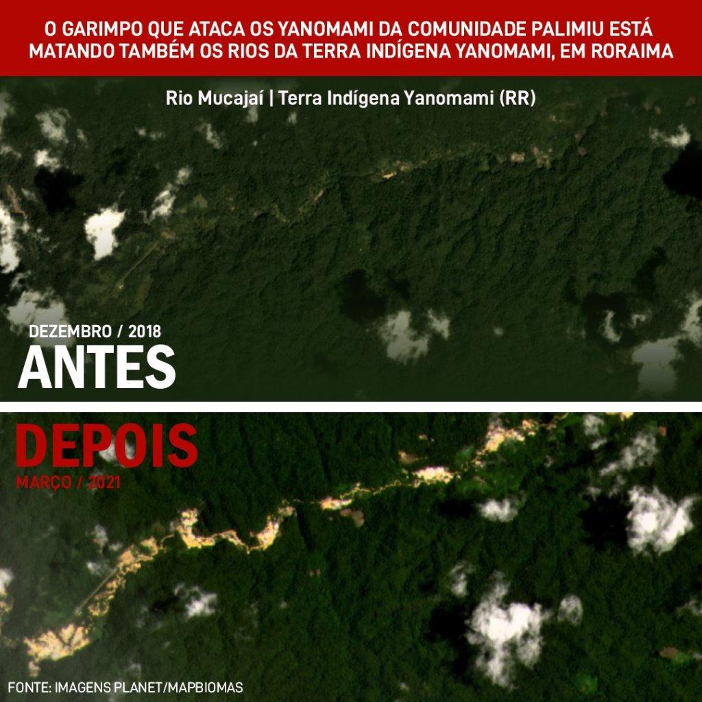 mars 2021: Les images satellites indiquaient un total cumulé de 2 430 hectares de forêt dévastée – « Les chercheurs d’or qui attaquent les Yanomami de la communauté Palimiu tuent également les rivières des terres indigènes Yanomami à Roraima »