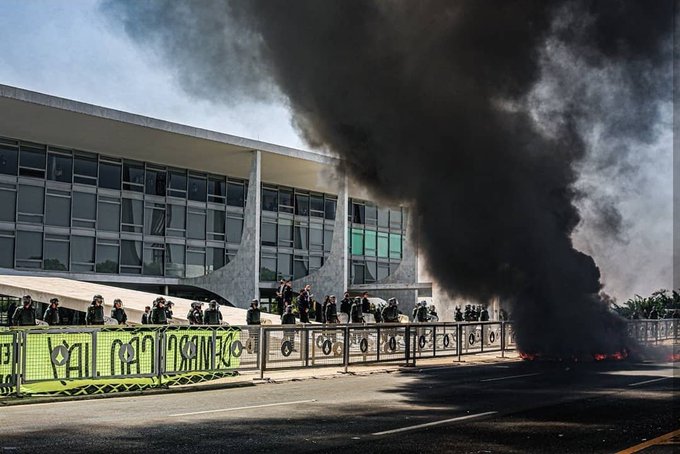 Un gruppo di circa 150 indigeni ha portato un’enorme bara simbolica sui gradini del palazzo presidenziale di Brasilia e gli ha dato fuoco.