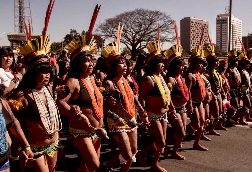 Du 7 au 11 septembre, plusieurs milliers de femmes de 150 nations indigènes se sont rassemblées pour marcher ensemble à Brasilia en faveur des droits qui leur sont garantis dans la Constitution du Brésil et contre la limite du « cadre temporel » et d’autres politiques anti-indigènes du président Bolsonaro.