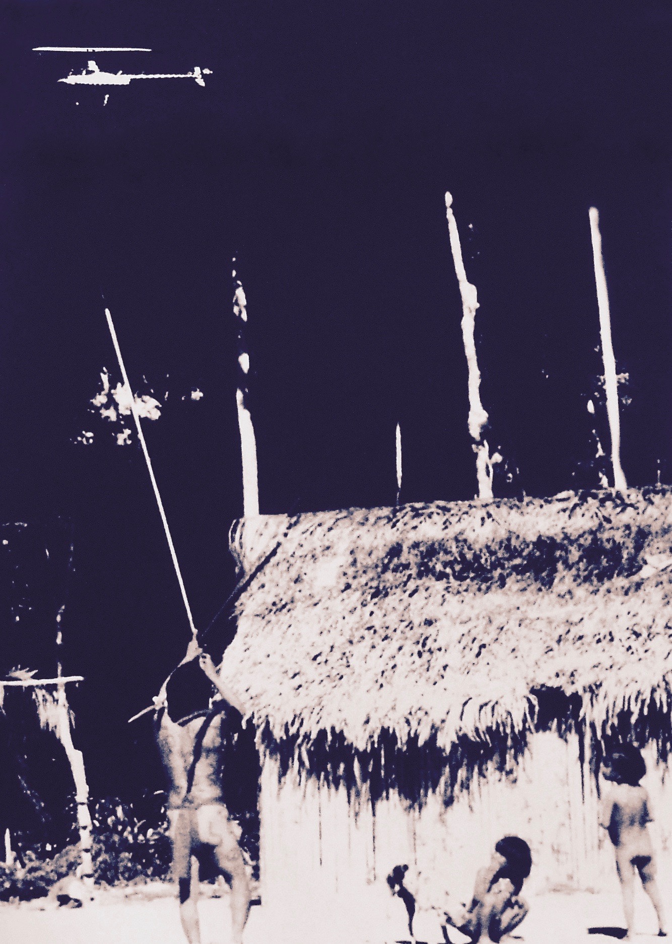 Photo d’un homme Yanomami avec arc et flèche, Amazonas, Venezuela et montage photo – Barbara Crane Navarro / Résultat du chaman Yanomami invoquant les esprits Hekura pour empêcher les intrus de détruire la forêt – Dessin sur papier – Wacayowë Yanomami