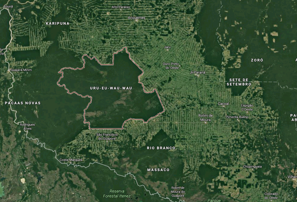 Imagens de satélite mostram uma floresta protegida em terras indígenas cercada por desmatamento e devastação.