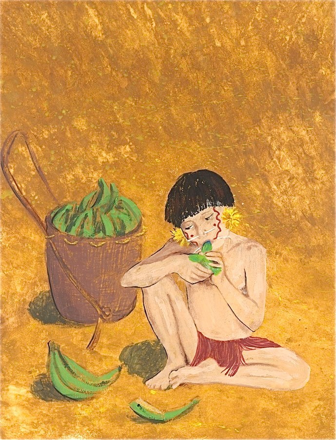 Through the Dogon and the Yanomami, my interest in the multiplicity of techniques and supports for aesthetic expression influenced my artistic practice. The voyages to the Amazon Rainforest have informed several series of paintings created while living among the Yanomami. The support used is roughly woven canvas prepared with acrylic medium then textured with a mixture of sand from the river bank and lava. This supple canvas is then rolled and transported on expeditions into the forest. They are then painted using a mixture of acrylic colors and Achiote and Genipap, the vegetal pigments used by the Yanomami for their ritual body paintings and on practical and shamanic implements.