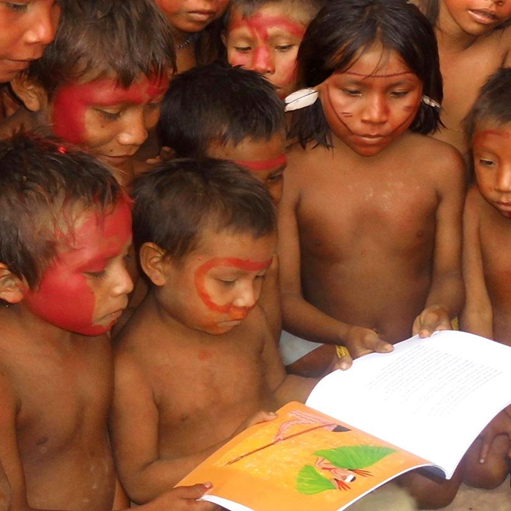 Niños Yanomami mirando el libro “La Magia de la Amazonia”