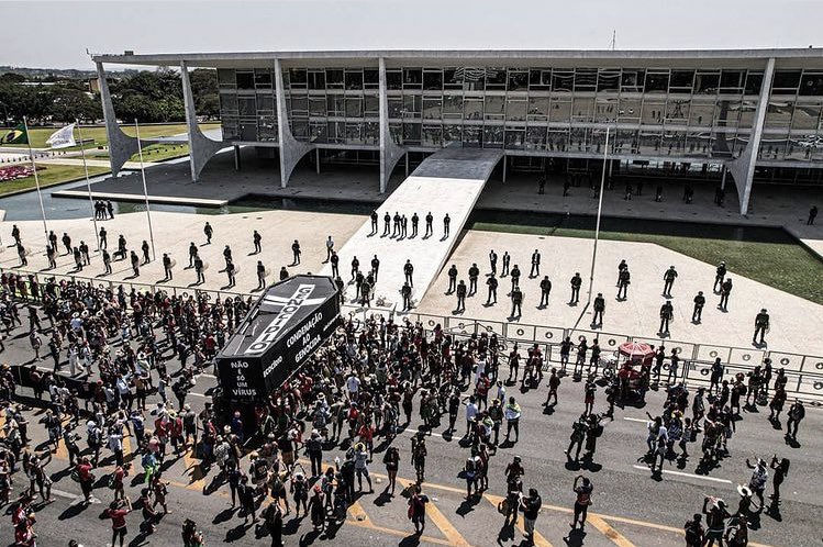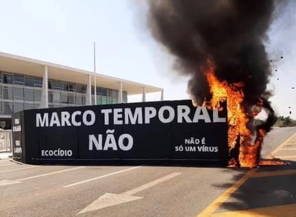 In September 2021, a group of around 150 Indigenous people carried an enormous symbolic coffin to the steps of the presidential palace in Brasilia and set it on fire. The coffin was inscribed with the word « Genocide » on the top with « Ecocide », « No to the Temporal Framework » as well as other slogans on the sides.