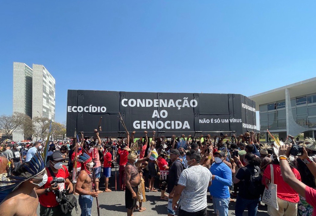 En septembre 2021, un groupe d’environ 150 autochtones a porté un énorme cercueil symbolique sur les marches du palais présidentiel de Brasilia et y a mis le feu. Le cercueil était inscrit avec le mot « Génocide » sur le dessus avec «  Ecocide », «  Non à la Cadre Temporel » ainsi que d’autres slogans sur les côtés.