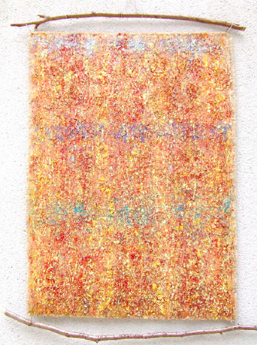 Through the Dogon and the Yanomami, my interest in the multiplicity of techniques and supports for aesthetic expression influenced my artistic practice. The voyages to the Amazon Rainforest have informed several series of paintings created while living among the Yanomami. The support used is roughly woven canvas prepared with acrylic medium then textured with a mixture of sand from the river bank and lava. This supple canvas is then rolled and transported on expeditions into the forest. They are then painted using a mixture of acrylic colors and Achiote and Genipap, the vegetal pigments used by the Yanomami for their ritual body paintings and on practical and shamanic implements.