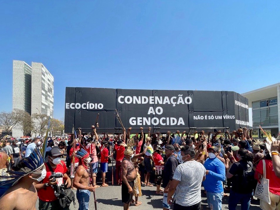 En septembre 2021, un groupe d’environ 150 autochtones a porté un énorme cercueil symbolique sur les marches du palais présidentiel de Brasilia et y a mis le feu. Le cercueil était inscrit avec le mot « Génocide » sur le dessus avec «  Ecocide », «  Non à la Cadre Temporel » ainsi que d’autres slogans sur les côtés.