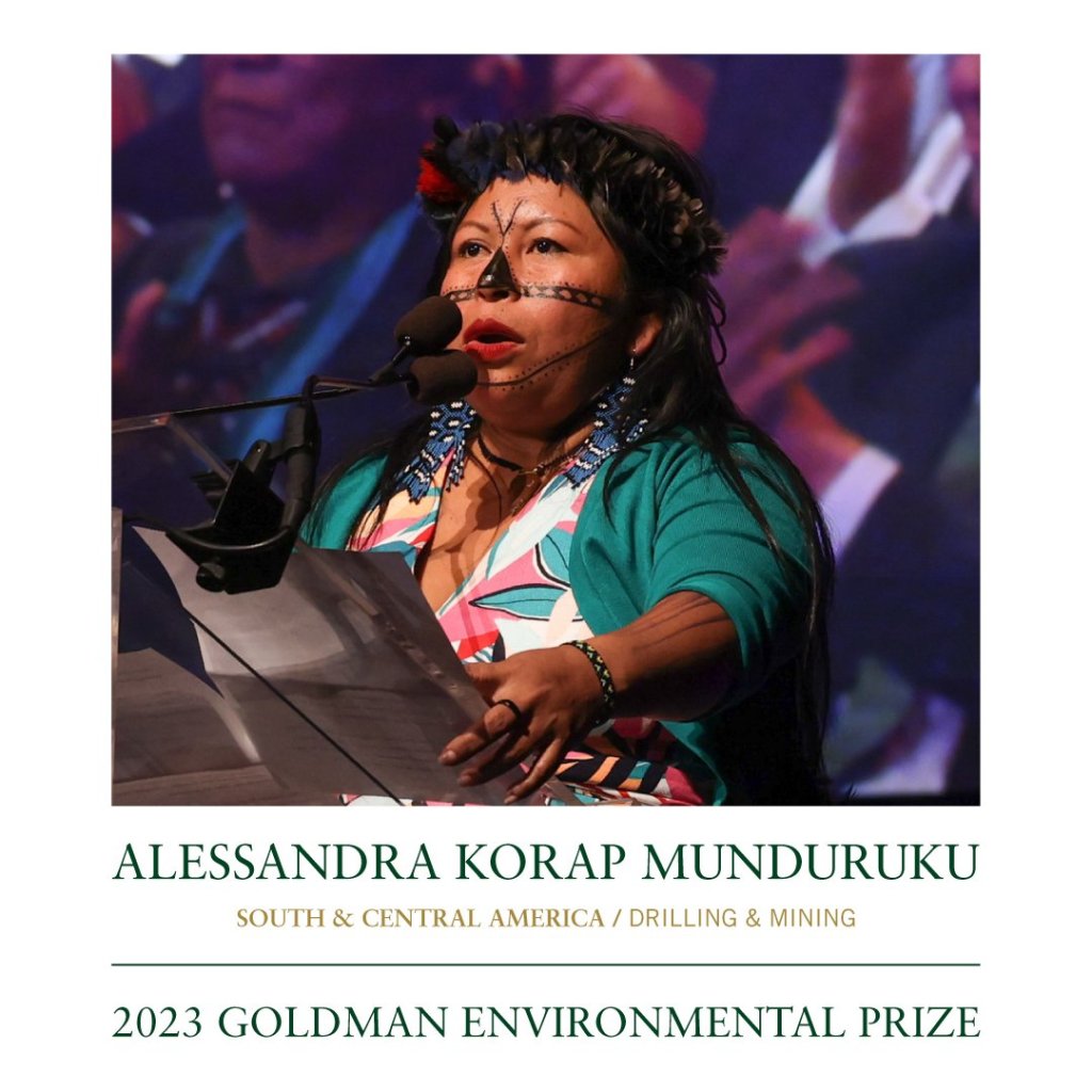 Alessandra Korap Munduruku accepted the Goldman Award at the ceremony in San Francisco, “The prize recognizes our struggle and tells the world ‘We are here’. Multinational companies cannot come In without consulting Indigenous people!