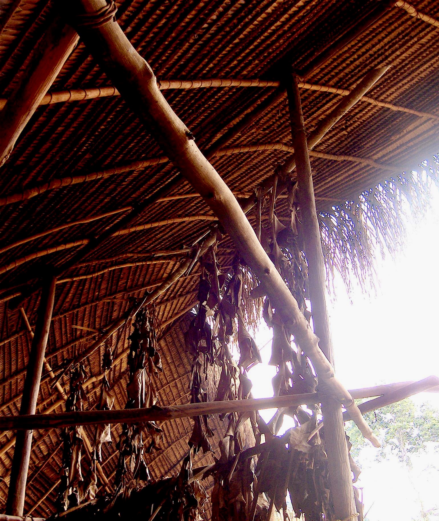 Effets personnels Yanomami suspendus sous le toit de la maison communale: tabac du jardin commun suspendu pour sécher