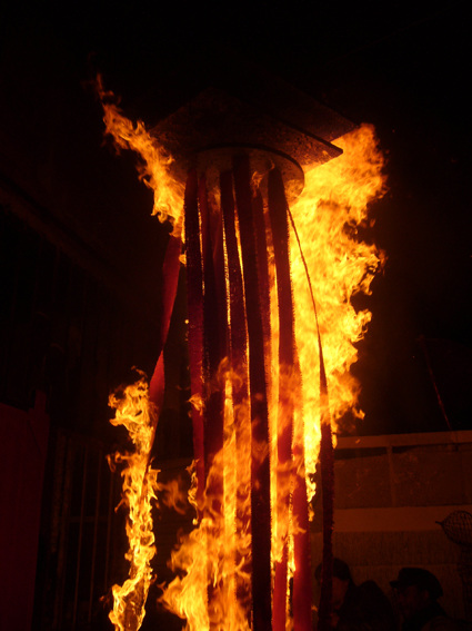Sculpture totémique brûlante – Performance “La forêt brûle” – La Miroiterie, Paris, France, 2006 – Barbara Crane Navarro