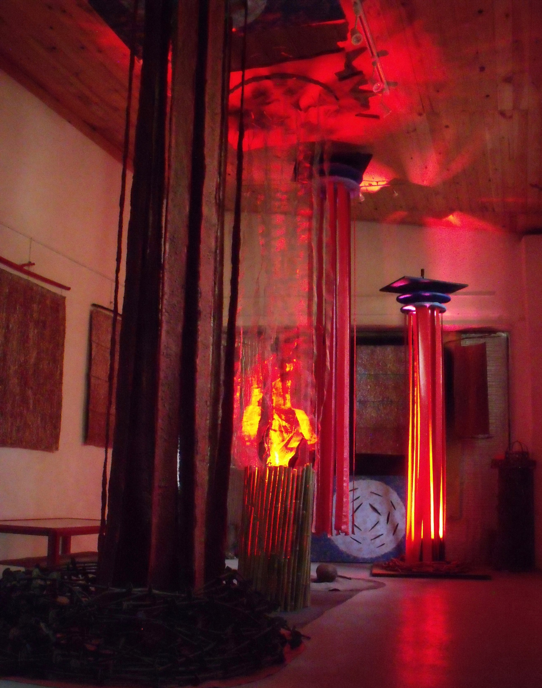 Sculptures lumineuses totémiques : « Les chamanes Yanomami luttent contre le xawara – fumée des épidémies »installation avec sons de chants chamaniques Yanomami – technique mixte – Film – 1:20 – Barbara Crane Navarro: