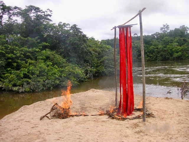 « Fire Performance » burning of one of my totemic sculptures and a traditional Yanomami basket on a sandbank along the Orinoco river in Amazonas, Venezuela – photo: Barbara Crane Navarro