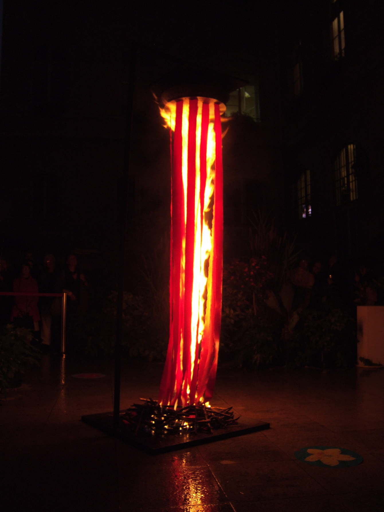 http://www.barbaranavarro.com My totemic sculpture consumed by fire at the Mairie du 2ème, Paris, France – photo: Barbara Crane Navarro