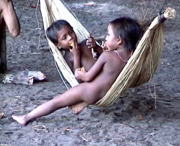 Yanomami boys in a traditional vine hammock sharing wild rasha fruits in the communal house(still from film)
